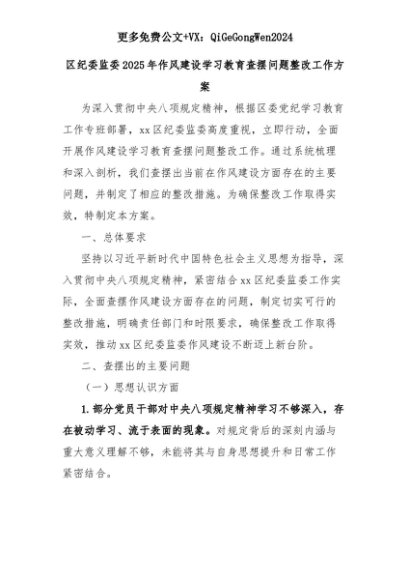 【七哥公文】2025年:区纪委监委2025年作风建设学习教育查摆问题整改工作方案+更多免费公文+VX:QiGeGongWen2024+更多免费公文+VX:QiGeGongWen2024