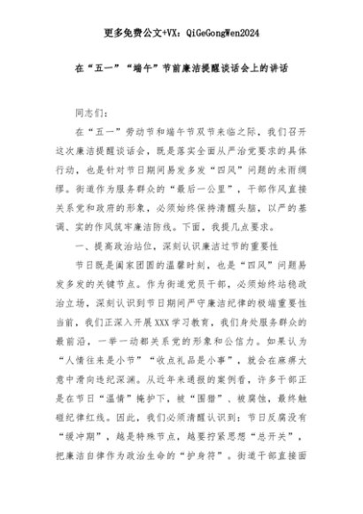 【七哥公文】2025年:在“五一”“端午”节前廉洁提醒谈话会上的讲话+更多免费公文+VX:QiGeGongWen2024+更多免费公文+VX:QiGeGongWen2024