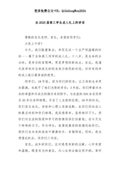 【七哥公文】2025年:在2025届高三学生成人礼上的讲话+更多免费公文+VX:QiGeGongWen2024+更多免费公文+VX:QiGeGongWen2024