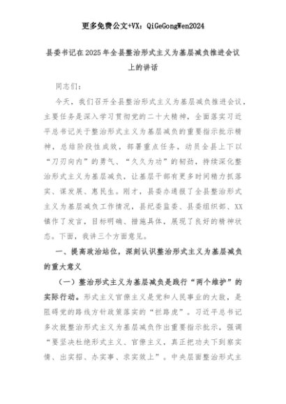 【七哥公文】2025年:县委书记在2025年全县整治形式主义为基层减负推进会议上的讲话+更多免费公文+VX:QiGeGongWen2024+更多免费公文+VX:QiGeGongWen2024