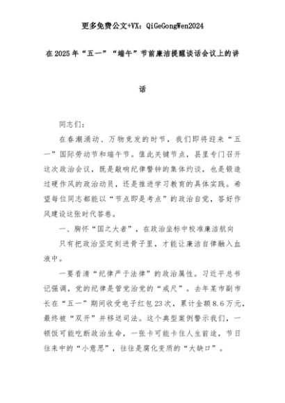 【七哥公文】2025年:在2025年“五一”“端午”节前廉洁提醒谈话会议上的讲话+更多免费公文+VX:QiGeGongWen2024+更多免费公文+VX:QiGeGongWen2024