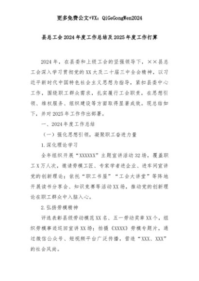 【七哥公文】2025年:县总工会2024年度工作总结及2025年度工作打算+更多免费公文+VX:QiGeGongWen2024+更多免费公文+VX:QiGeGongWen2024