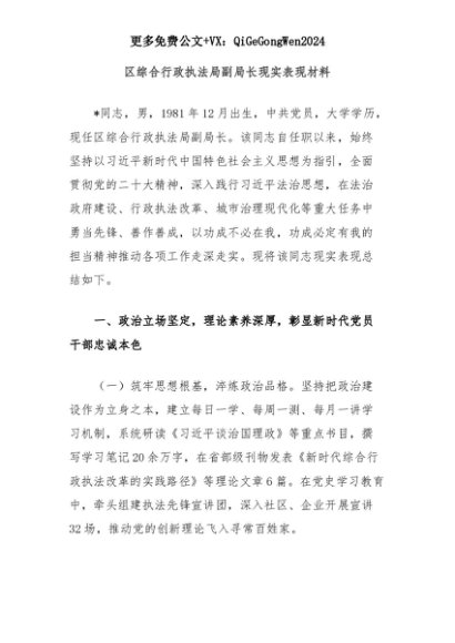【七哥公文】2025年:区综合行政执法局副局长现实表现材料+更多免费公文+VX:QiGeGongWen2024+更多免费公文+VX:QiGeGongWen2024