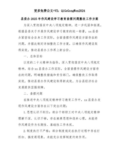 【七哥公文】2025年:县委办2025年作风建设学习教育查摆问题整改工作方案+更多免费公文+VX:QiGeGongWen2024+更多免费公文+VX:QiGeGongWen2024