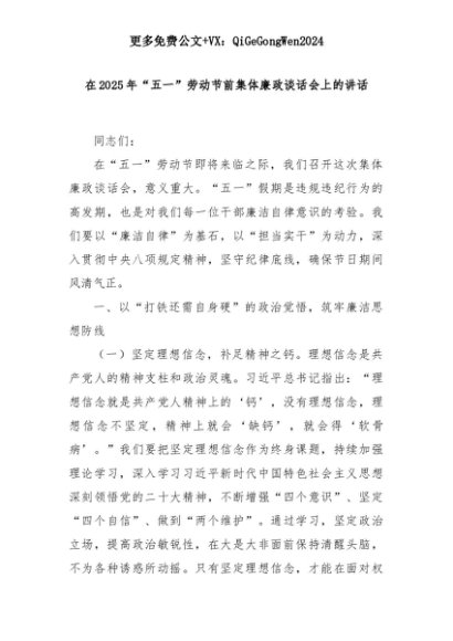 【七哥公文】2025年:在2025年“五一”劳动节前集体廉政谈话会上的讲话+更多免费公文+VX:QiGeGongWen2024+更多免费公文+VX:QiGeGongWen2024