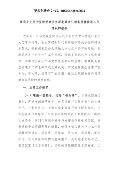 【七哥公文】2025年:国有企业关于坚持党建业务深度融合引领高质量发展工作情况的报告+更多免费公文+VX:QiGeGongWen2024+更多免费公文+VX:QiGeGongWen2024
