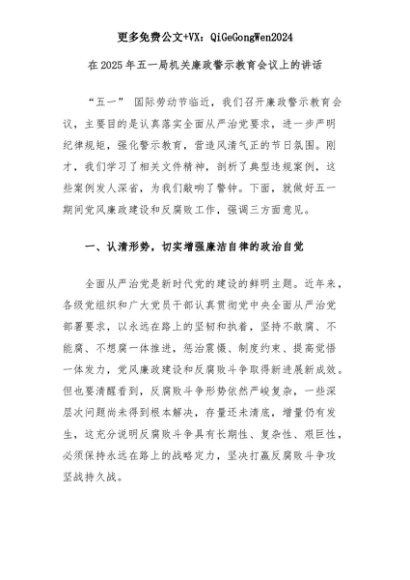 【七哥公文】2025年:在2025年五一局机关廉政警示教育会议上的讲话+更多免费公文+VX:QiGeGongWen2024+更多免费公文+VX:QiGeGongWen2024