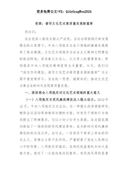 【七哥公文】2025年:党课:谱写文化艺术高质量发展新篇章+更多免费公文+VX:QiGeGongWen2024+更多免费公文+VX:QiGeGongWen2024
