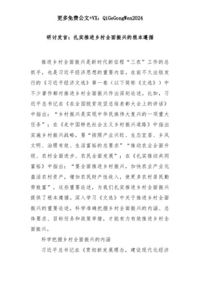 【七哥公文】2025年:研讨发言:扎实推进乡村全面振兴的根本遵循+更多免费公文+VX:QiGeGongWen2024+更多免费公文+VX:QiGeGongWen2024