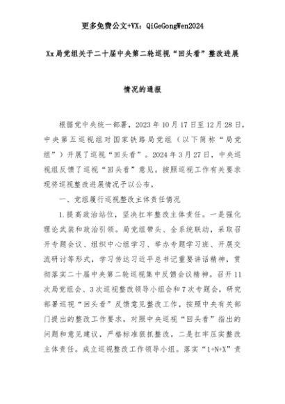 【七哥公文】2025年:Xx局党组关于二十届中央第二轮巡视“回头看”整改进展情况的通报+更多免费公文+VX:QiGeGongWen2024+更多免费公文+VX:QiGeGongWen2024