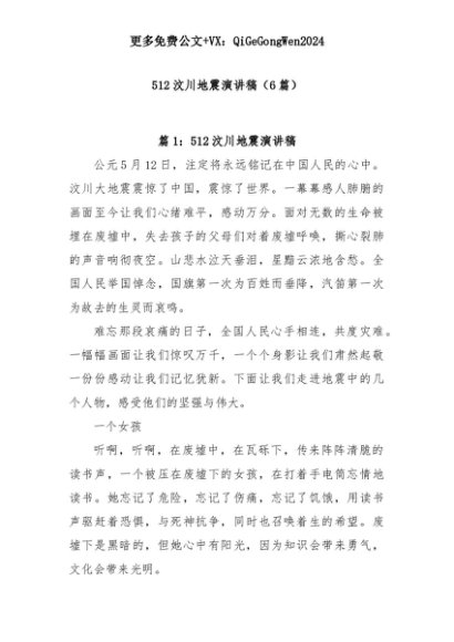 【七哥公文】2025年:(6篇)512汶川地震演讲稿+更多免费公文+VX:QiGeGongWen2024+更多免费公文+VX:QiGeGongWen2024