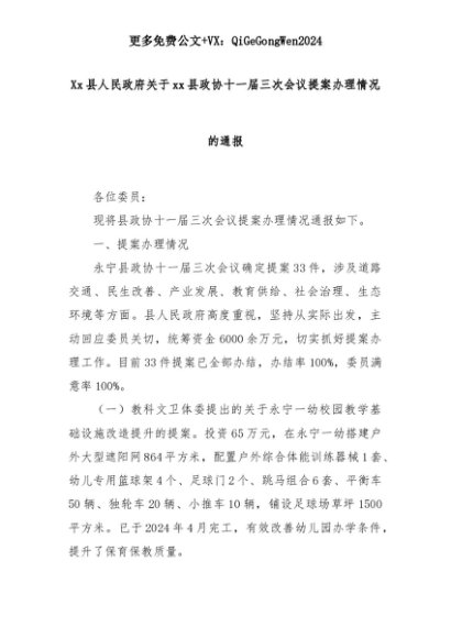 【七哥公文】2025年:Xx县人民政府关于xx县政协十一届三次会议提案办理情况的通报+更多免费公文+VX:QiGeGongWen2024+更多免费公文+VX:QiGeGongWen2024