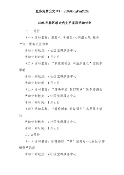 【七哥公文】2025年:2025年社区新时代文明实践活动计划+更多免费公文+VX:QiGeGongWen2024+更多免费公文+VX:QiGeGongWen2024