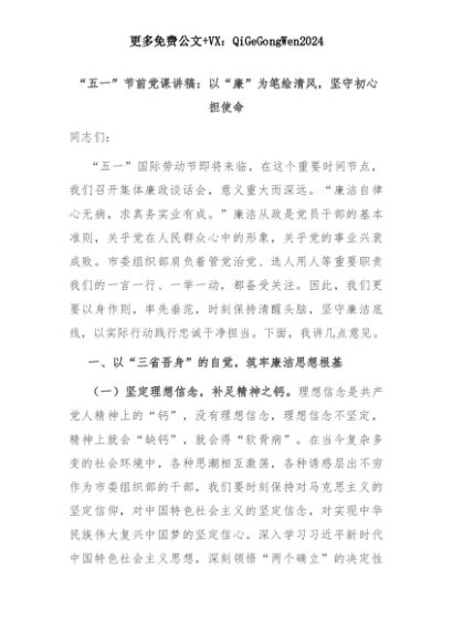 【七哥公文】2025年:“五一”节前党课讲稿:以“廉”为笔绘清风,坚守初心担使命+更多免费公文+VX:QiGeGongWen2024+更多免费公文+VX:QiGeGongWen2024