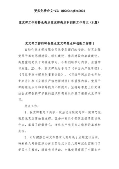 【七哥公文】2025年:(8篇)党支部工作的特色亮点党支部亮点和创新工作范文+更多免费公文+VX:QiGeGongWen2024+更多免费公文+VX:QiGeGongWen2024