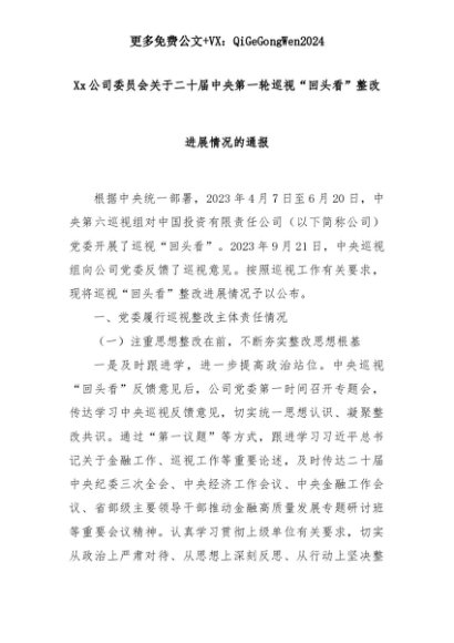 【七哥公文】2025年:Xx公司委员会关于二十届中央第一轮巡视“回头看”整改进展情况的通报+更多免费公文+VX:QiGeGongWen2024+更多免费公文+VX:QiGeGongWen2024