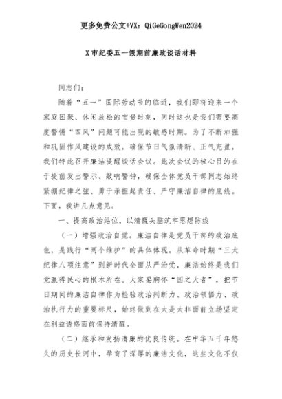 【七哥公文】2025年:X市纪委五一假期前廉政谈话材料+更多免费公文+VX:QiGeGongWen2024+更多免费公文+VX:QiGeGongWen2024