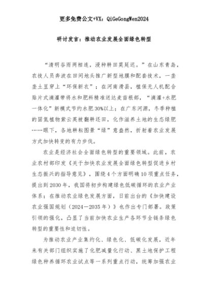 【七哥公文】2025年:研讨发言:推动农业发展全面绿色转型+更多免费公文+VX:QiGeGongWen2024+更多免费公文+VX:QiGeGongWen2024