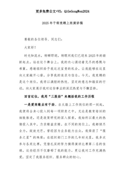 【七哥公文】2025年:2025年干部竞聘上岗演讲稿+更多免费公文+VX:QiGeGongWen2024+更多免费公文+VX:QiGeGongWen2024
