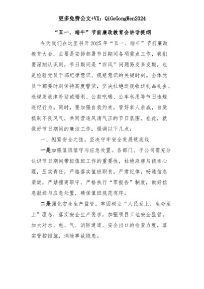 【七哥公文】2025年:“五一、端午”节前廉政教育会讲话提纲+更多免费公文+VX:QiGeGongWen2024+更多免费公文+VX:QiGeGongWen2024