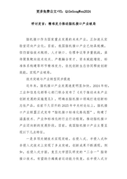 【七哥公文】2025年:研讨发言:精准发力推动脑机接口产业破局+更多免费公文+VX:QiGeGongWen2024+更多免费公文+VX:QiGeGongWen2024