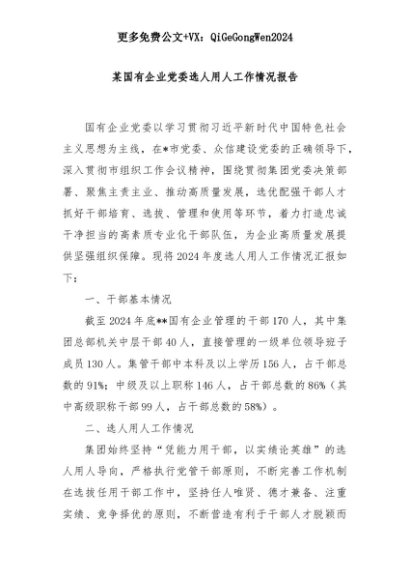 【七哥公文】2025年:某国有企业党委选人用人工作情况报告+更多免费公文+VX:QiGeGongWen2024+更多免费公文+VX:QiGeGongWen2024