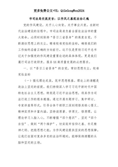 【七哥公文】2025年:市司法局交流发言:以作风之基筑法治之魂+更多免费公文+VX:QiGeGongWen2024+更多免费公文+VX:QiGeGongWen2024