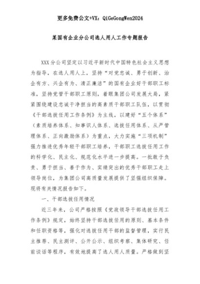 【七哥公文】2025年:某国有企业分公司选人用人工作专题报告+更多免费公文+VX:QiGeGongWen2024+更多免费公文+VX:QiGeGongWen2024
