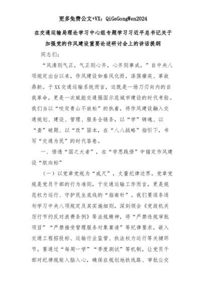 【七哥公文】2025年:在交通运输局理论学习中心组专题学习习近平总书记关于加强党的作风建设重要论述研讨会上的讲话提纲+更多免费公文+VX:QiGeGongWen2024+更多免费公文+VX:QiGeGongWen2024