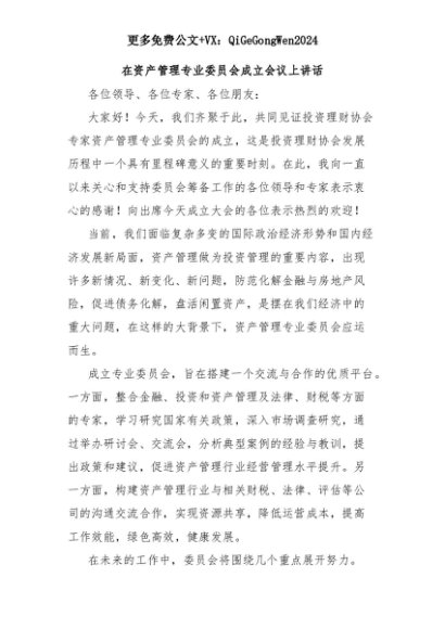 【七哥公文】2025年:在资产管理专业委员会成立会议上讲话+更多免费公文+VX:QiGeGongWen2024+更多免费公文+VX:QiGeGongWen2024