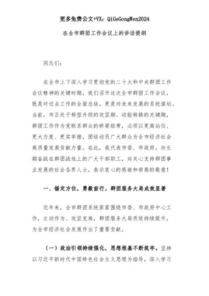 【七哥公文】2025年:在全市群团工作会议上的讲话提纲+更多免费公文+VX:QiGeGongWen2024+更多免费公文+VX:QiGeGongWen2024