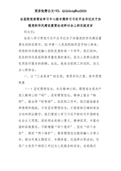 【七哥公文】2025年:在医院党委理论学习中心组专题学习习近平总书记关于加强党的作风建设重要论述研讨会上的交流发言+更多免费公文+VX:QiGeGongWen2024+更多免费公文+VX:QiGeGongWen2024