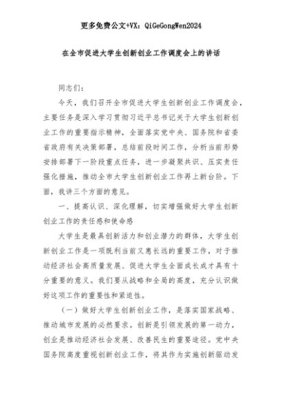 【七哥公文】2025年:在全市促进大学生创新创业工作调度会上的讲话+更多免费公文+VX:QiGeGongWen2024+更多免费公文+VX:QiGeGongWen2024