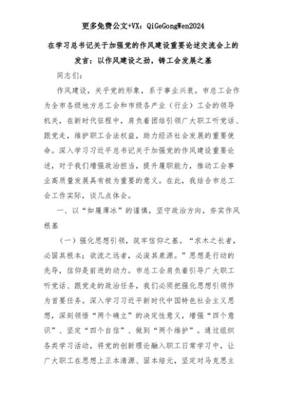 【七哥公文】2025年:在学习总书记关于加强党的作风建设重要论述交流会上的发言:以作风建设之劲,铸工会发展之基+更多免费公文+VX:QiGeGongWen2024+更多免费公文+VX:QiGeGongWen2024