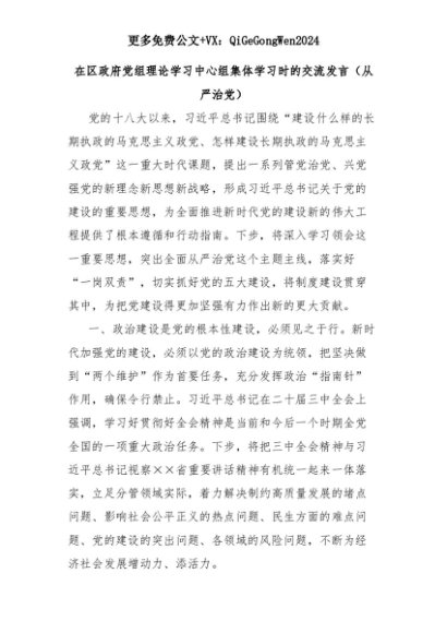 【七哥公文】2025年:在区政府党组理论学习中心组集体学习时的交流发言(从严治党)+更多免费公文+VX:QiGeGongWen2024+更多免费公文+VX:QiGeGongWen2024