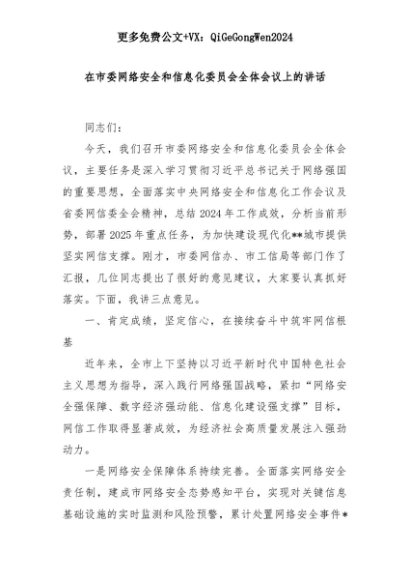 【七哥公文】2025年:在市委网络安全和信息化委员会全体会议上的讲话+更多免费公文+VX:QiGeGongWen2024+更多免费公文+VX:QiGeGongWen2024