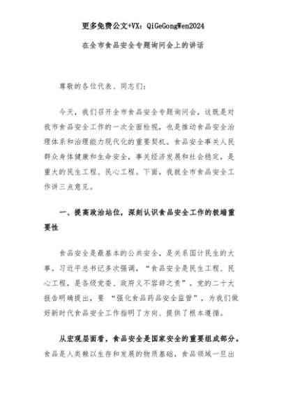 【七哥公文】2025年:在全市食品安全专题询问会上的讲话+更多免费公文+VX:QiGeGongWen2024+更多免费公文+VX:QiGeGongWen2024