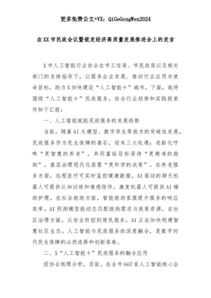 【七哥公文】2025年:在XX市民政会议暨银发经济高质量发展推进会上的发言+更多免费公文+VX:QiGeGongWen2024+更多免费公文+VX:QiGeGongWen2024