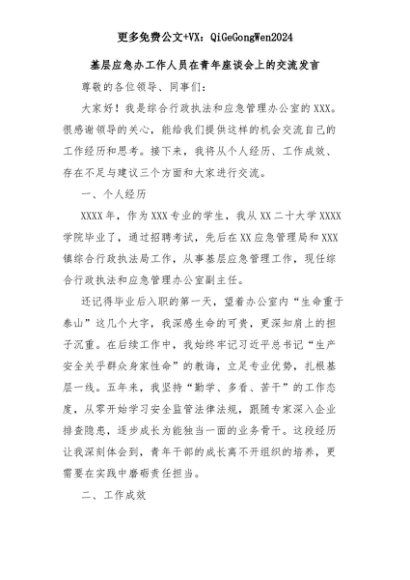 【七哥公文】2025年:基层应急办工作人员在青年座谈会上的交流发言+更多免费公文+VX:QiGeGongWen2024+更多免费公文+VX:QiGeGongWen2024