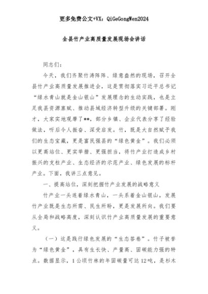 【七哥公文】2025年:全县竹产业高质量发展现场会讲话+更多免费公文+VX:QiGeGongWen2024+更多免费公文+VX:QiGeGongWen2024