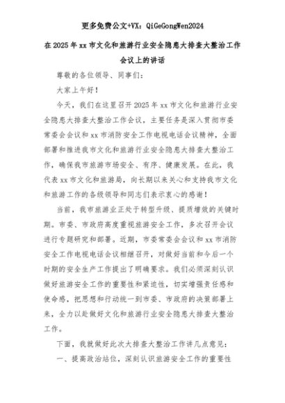 【七哥公文】2025年:在2025年xx市文化和旅游行业安全隐患大排查大整治工作会议上的讲话+更多免费公文+VX:QiGeGongWen2024+更多免费公文+VX:QiGeGongWen2024