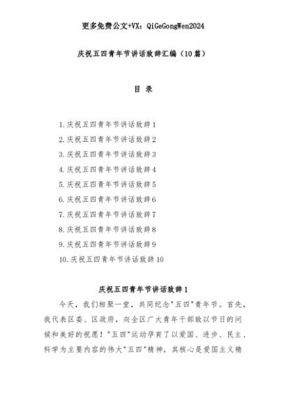 【七哥公文】2025年:(10篇)庆祝五四青年节讲话致辞汇编+更多免费公文+VX:QiGeGongWen2024+更多免费公文+VX:QiGeGongWen2024