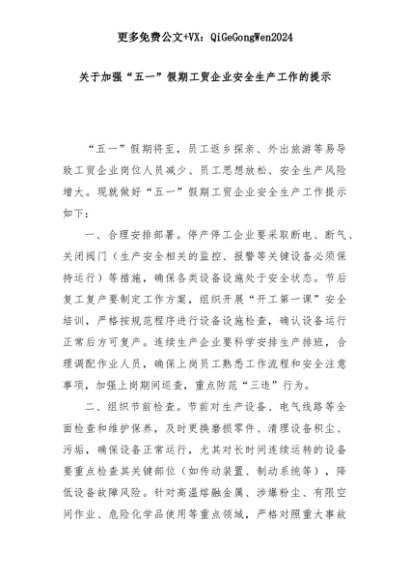 【七哥公文】2025年:关于加强“五一”假期工贸企业安全生产工作的提示+更多免费公文+VX:QiGeGongWen2024+更多免费公文+VX:QiGeGongWen2024