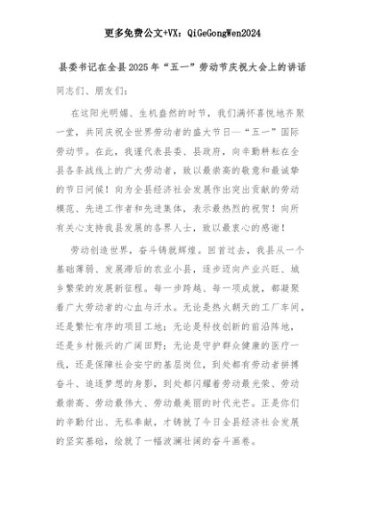 【七哥公文】2025年:县委书记在全县2025年“五一”劳动节庆祝大会上的讲话+更多免费公文+VX:QiGeGongWen2024+更多免费公文+VX:QiGeGongWen2024