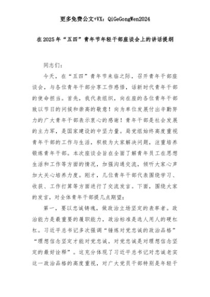 【七哥公文】2025年:在2025年“五四”青年节年轻干部座谈会上的讲话提纲+更多免费公文+VX:QiGeGongWen2024+更多免费公文+VX:QiGeGongWen2024