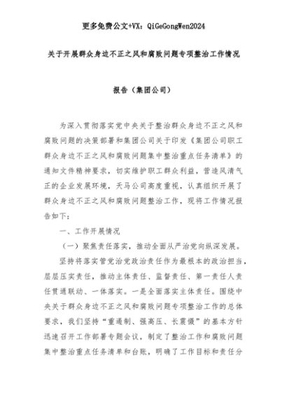 【七哥公文】2025年:关于开展群众身边不正之风和腐败问题专项整治工作情况报告(集团公司)+更多免费公文+VX:QiGeGongWen2024+更多免费公文+VX:QiGeGongWen2024