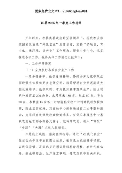 【七哥公文】2025年:XX县2025年一季度工作总结+更多免费公文+VX:QiGeGongWen2024+更多免费公文+VX:QiGeGongWen2024