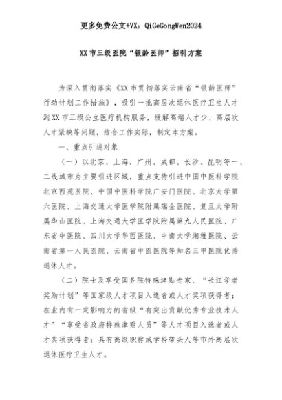 【七哥公文】2025年:XX市三级医院“银龄医师”招引方案+更多免费公文+VX:QiGeGongWen2024+更多免费公文+VX:QiGeGongWen2024