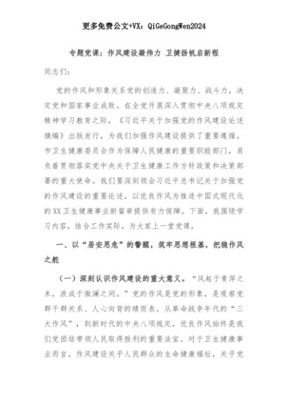 【七哥公文】2025年:专题党课:作风建设凝伟力 卫健扬帆启新程+更多免费公文+VX:QiGeGongWen2024+更多免费公文+VX:QiGeGongWen2024