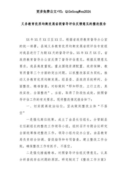 【七哥公文】2025年:义务教育优质均衡发展省级督导评估反馈意见的整改报告+更多免费公文+VX:QiGeGongWen2024+更多免费公文+VX:QiGeGongWen2024